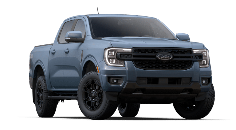 Azure Gray Metallic 2025 Ford Ranger Lariat 4WD 10-Speed Automatic EcoBoost 2.3L I4 GTDi DOHC Turbocharged VCT 4WD, 10 Speakers, 120V/400W In-Cab & In-Bed Power Outlets, 4-Wheel Disc Brakes, ABS brakes, Air Conditioning, Alloy wheels, AM/FM radio: SiriusXM, Auto High-beam Headlights, Auto-dimming Rear-View mirror, Automatic temperature control, Black Appearance Package, Black Center Bar & Surround Grille, Black Rear Bumper, Black Running Boards, Body-Color Painted Front Fascia, Brake assist, Class IV Trailer Hitch Receiver, Compass, Convenience Package, Delay-off headlights, Driver door bin, Driver vanity mirror, Dual front impact airbags, Dual front side impact airbags, Electronic Stability Control, Emergency communication system: SYNC 4 911 Assist, Equipment Group 500A Standard, Front & Rear Black Ford Ovals, Front & Rear Splash Guards/Mud Flaps, Front anti-roll bar, Front Bucket Seats, Front Center Armrest, Front dual zone A/C, Front fog lights, Front reading lights, Front wheel independent suspension, Fully automatic headlights, FX4 Off-Road Box Decal, FX4 Off-Road Package, FX4 Selectable Drive Modes, Garage door transmitter, Gray Painted Center Bar & Grille Surround, Gray Painted Front Fascia & Rear Bumper, Heated door mirrors, Heated front seats, Heated steering wheel, Illuminated entry, Internet access capable: FordPass Connect 4G, Leather Shift Knob, Leather steering wheel, Leather-Trimmed Front Heated Bucket Seats, Low tire pressure warning, Memory seat, Navigation system: Connected Navigation, Occupant sensing airbag, Off-Road Screen in Center Stack, Off-Road Tuned Shocks, Outside temperature display, Overhead airbag, Overhead console, Painted Body-Color Wheel Lip Molding, Panic alarm, Passenger door bin, Passenger vanity mirror, Power door mirrors, Power driver seat, Power passenger seat, Power steering, Power windows, Radio: B&O Sound System by Bang & Olufsen, Rain sensing wipers, Rear reading lights, Rear seat center armrest, Rear step bumper, Rear window defroster, Remote keyless entry, Security system, SiriusXM Satellite Radio, Speed control, Speed-sensing steering, Sport Appearance Package, Sport Box Decal, Steering wheel mounted audio controls, SYNC 4A w/Connected Navigation, Telescoping steering wheel, Tilt steering wheel, Traction control, Trail Control, Trailer Tow Package, Tray Style Floor Liner w/Carpet Floor Mats, Trip computer, Turn signal indicator mirrors, Unique Carpet Mats, Variably intermittent wipers, Voltmeter, Wheels: 18 Black Painted, Wheels: 18 Machined Aluminum w/Dark Pockets, Wireless Charging Pad, 4WD.